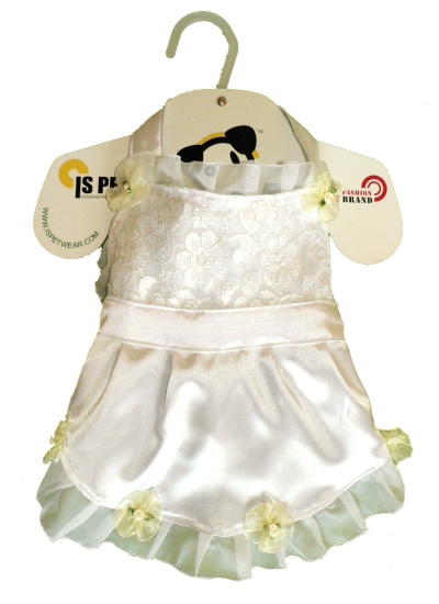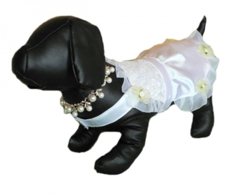 Krásné svatební šaty pro vaši princeznu. Jedná se o velice vypracované svatební šaty v kombinaci satén/ krajka. Po obvodu zdobeno žlutými kytičkami (barva kytiček se může měnit). Svatební šaty dodáváme v běžných velikostech S, M, L. V případě přání šijeme šaty také na zakázku, dle individuální velikosti Vašeho pejska.